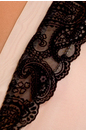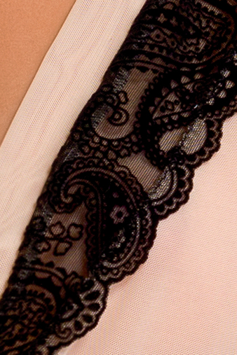 Красивый воздушный пеньюар бежевого цвета с черными кружевными вставками. Полупрозрачный, нежный и приятный к коже тюль обволакивает тело, оставляя ему свободу движений. Завязка на талии обеспечивает