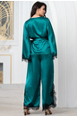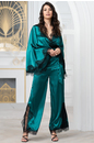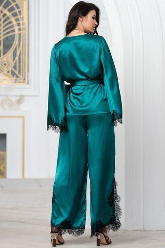 Комплект с брюками и жакетом Windsor от Mia-Amore выполнен из смесового шёлка. Брюки с боковыми разрезами отделаны по низу кружевом. Жакет запашной с завязкой в виде широкого пояса. Вырез горловины сп