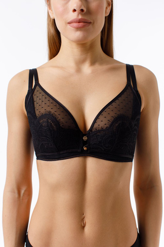 Бюстгальтер с мягкой чашкой состоит из двух деталей: нижняя выполнена из поролона обтянутого эластичной сеткой, верхняя выполнена из эластичной сетки и эластичного кружева. На деталях верхней чашки располагаются петельки, при помощи которых чашку можно расстегнуть. Украшение - металлические пуговицы, к которым при желании можно пристегнуть чокер. Бельё данного бренда - успешное сочетание традиций искусства создания женского белья и новых, всегда актуальных тенденций. Белье Coquette Revue, следуя французским традициям стиля, даёт возможность женщинам почувствовать себя счастливыми, ощутить свою индивидуальность, примерить на себя все новые и новые образы. Коллекции имеют идеальную посадку, широкой модельный и размерный ряд, всегда соответствуют самым высоким требованиям. Производитель: Coquette Revue. Страна производителя: Франция. Состав материала изделия: 85% полиамид, 15% эластан.