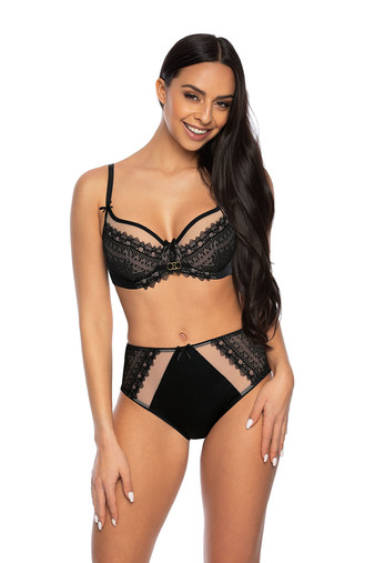 Высокие трусики Marion в черно-бежевом цвете. Передняя часть трусиков из эластичной сетки в сочетании с кружевной вставкой и микрофиброй. Спинка из микрофибры с небольшой кружевной вставкой. Трусики и