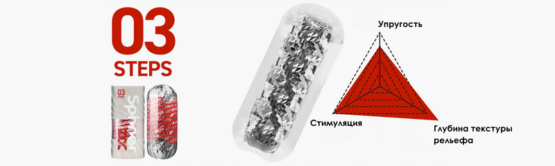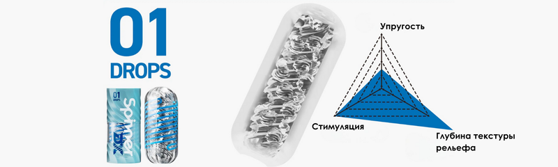 Самое главное — у каждого мастурбатора этой серии свой рельеф внутри. Drops, Bumps и Steps — три совершенно разных сценария мастурбации, чтобы выбрать тот способ стимуляции, который лучше всего ведёт к яркому, запоминающемуся оргазму. Ниже — подробнее о каждом из трёх вариантов: