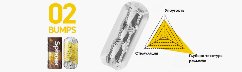 Рельеф Bumps — чередующиеся волны плавных выступов и мягких гребней, будто упругие языки скользят навстречу друг другу, мгновенно накрывая ствол то плотным сжатием, то нежным скольжением. Каждый миллиметр обхватывается по-новому: ощущения постоянно сменяются, создавая пульсирующую волну, которая катится по всей длине пениса и возвращается, даря острую, но чувственно обволакивающую стимуляцию. Этот рельеф словно специально создан для тех, кто ценит яркое, насыщенное удовольствие — здесь ощущается и крепость сжатия, и богатая фактура движений, пробуждающая все нервные окончания. Bumps подойдёт, если хочется мощных, плотных ощущений касания, но при этом без излишней жёсткости — более интенсивно, чем Drops, но мягче, чем Steps.