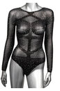 Сеточка тонкая, почти невесомая, но достаточно прочная, чтобы держать форму и красиво ложиться по телу. Геометричный рисунок плотных вставок визуально вытягивает и моделирует фигуру. Длинные рукава добавляют элегантности, а стринговый крой подчёркивает ягодицы.