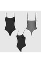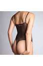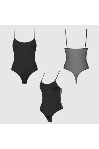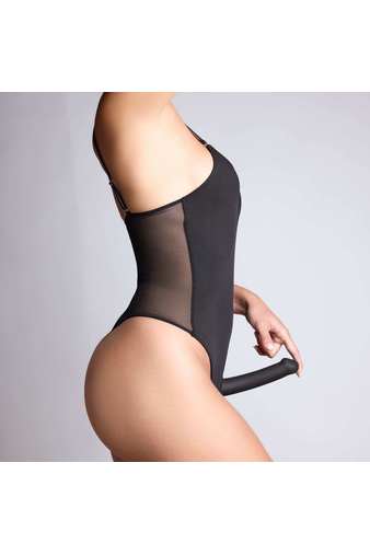 Спереди – гладкая микрофибра элегантно облегает силуэт. Сзади — прозрачная сетчатая ткань играет на контрасте, притягивая взгляд, а рельефный золотистый логотип добавляет яркий акцент. Минималистичная стринговская спинка подчёркивает смелость и утончённость.