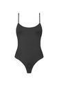 Передняя часть выполнена из гладкой микрофибры, она плотно и ровно ложится на тело, не создавая лишних складок. Задняя – из полупрозрачной сетки, за счет этого боди смотрится легче и визуально открывает больше тела. Формат стрингов подчеркивает бедра и оставляет ягодицы максимально открытыми.