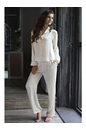 Классическая пижама. Состоит из жакета и длинных брюк из натурального шелка. Жакет полуприлегающего покроя с застежкой на пуговицы и отложным воротником. Рукав втачной на манжете. Длинные брюки свободного покроя на эластичной тесьме (резинке) в поясе, с карманами в боковых швах. Состав: 100% шелк