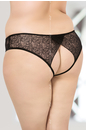 Трусики с доступом, выполненные из фактурного кружева, вырез в интимной зоне декорирован стразами.