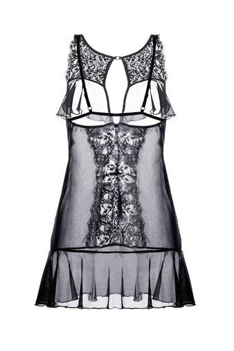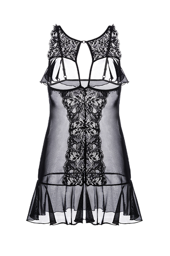 Комбинация из эластичной сетки со вставками кружева. Открытый бюст и подол декорированы мягкими оборками. Регулируемые бретели. Внимание! Продукт может иметь несколько вариантов производственной упако