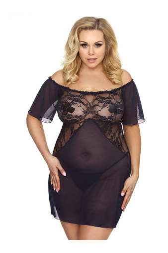 Прозрачная сорочка больших размеров облегающего фасона и короткой длины. Сексуальная сорочка с красивым вырезом декольте, плечи эффектно обнажены, верхняя кромка с тонкой резиночкой, прозрачные легкие