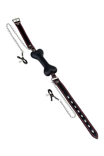 Силиконовый кляп-трензель на ремешке из PU-кожи лишает возможности разговаривать, при этом его комфортно прикусывать. Дополнительно стимулировать нижнего можно изменяя степень давления на соски зажима