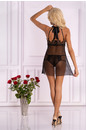 Прозрачная черная сорочка из тонкого тюля в горошек. Зона декольте украшена аппликацией и кружевом, перекликающимися с узором на трусиках. Сзади модель завязывается эффектным атласным бантом. Бретели регулируются по длине. Кружевные трусики включены в комплект. Состав материала изделия: 90% Полиамид, 10% Эластан.