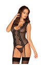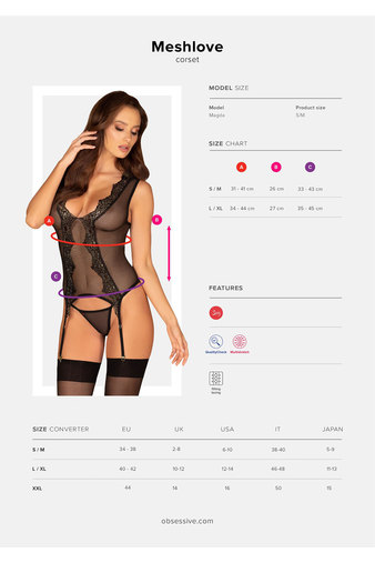 Эффектный корсет выполнен из полупрозрачной сеточки и кружева. На спинке очаровательная шнуровка. Пажи для чулок регулируются по длине. В комплект к корсету идут трусики-стринги. Чулки в комплект не входят. Корсет упакован в красивую плотную коробку и отлично подойдет в качестве оригинального подарка. Состав материала изделия: 90% Полиамид, 10% Эластан.