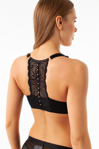 Бюстгальтер «пуш-ап» c формованными чашками с гелем, с декорированной спинкой из кружева. Создает эффект роскошного декольте. Чашки обтянуты эластичным сеткой и спереди чашка украшена элементами в вид