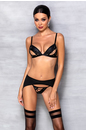 Комплект нижнего белья "Мили" состоит из трех предметов: топ с открытой грудью, трусики стринги с оригинальной шнуровкой и пояс для чулок. Выполнен из гладкого материала, имитирующего кожу. Смелый кр