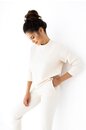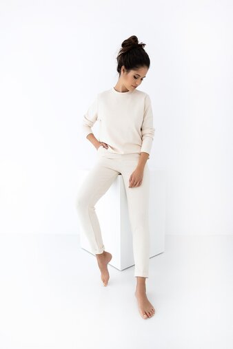 Повседневная однотонный костюм Latika состоит из лонгслива и брюк. Лонгслив прямого кроя, с круглым вырезом горловины. Брючки зауженные, с карманами. Идеальный вариант не только для сна, но и для дома