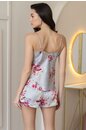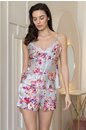 Комплект Mia-Amore состоит из топа и шорт, выполнен из принтованной смесовой ткани ткани. Верх топа украшен узким кружевом. На шортах расположены карманы и разрезы. Декор - двухцветный атласный бантик по центру.