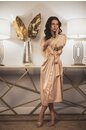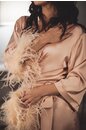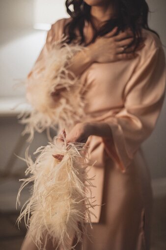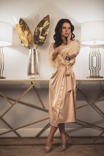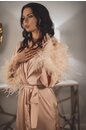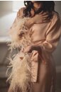 Самый эффектный и популярный халат-накидка с боа, вызывающий бурю эмоций и интереса к твоему образу. Халат-накидка из персикового армани шелка, струящегося по твоему телу, создающего эффект второй кож