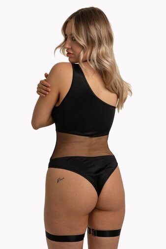 Чувственное боди на одно плечо Kora. Боди соблазнительно подчеркивает изгибы женского тела и талию. Благодаря тюлевой сетчатой вставке от плеча до бедра удлиняет и стройнит ноги. Необычные подвязки до